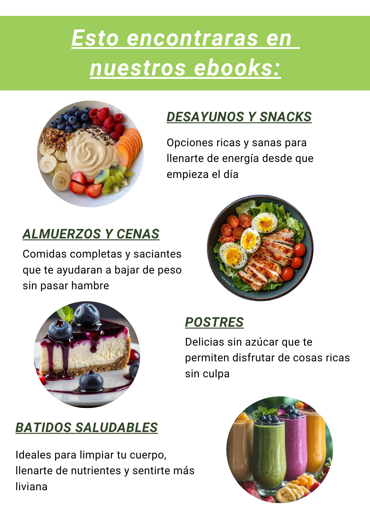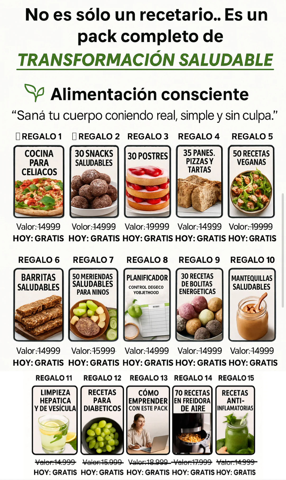 El libro incluye más de 1000 recetas saludables para desayunos, almuerzos, cenas, snacks y postres. Además de los 10 bonos exclusivos con recetas adicionales y guías completas.